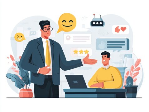 A businessman uses online customer feedback to rate service experience data exchange and analysis with a chat bot. A customer support centre using artificial intelligence