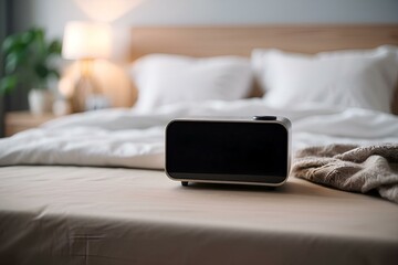 Digital alarm clock with a blank screen in a blurred bedroom background, generative AI