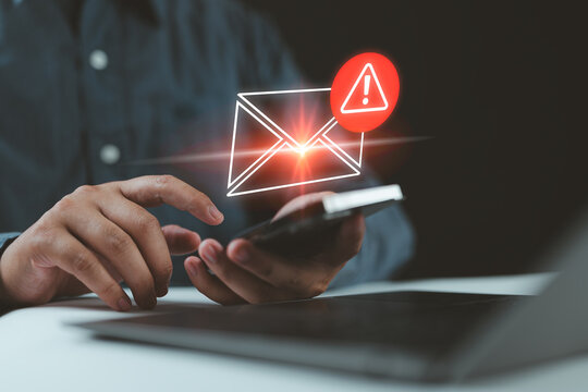 SMS spam, fake text message phishing from scammer concept. System hacked red warning alert, email hack, scam malware spreading virus on message alert virtual on mobile phone screen in person hand.