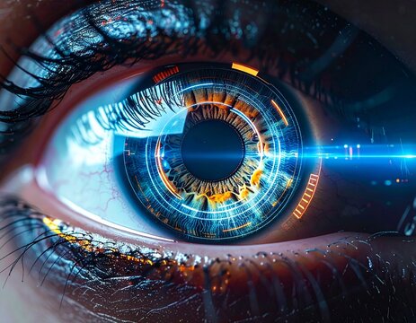 Macro Shot of a Human Blue Iris with Futuristic Digital Scanning Interface
