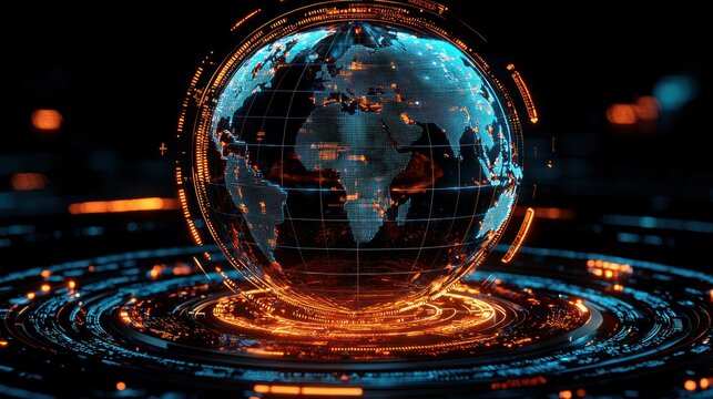 Glowing digital earth hologram with circuits and vibrant orange undertones