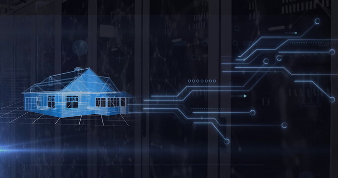 Image of interface charts processing data over blue house