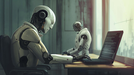 In a futuristic office, two advanced robots collaborate on programming tasks, showing the integration of AI in modern workplaces. The scene displays automation, coding, collaboration, and technology