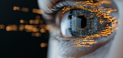 Eye technology data concept. A close-up of an eye merged with digital data streams, symbolizing technology, vision, and the interface between humanity and digital innovation.