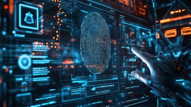 High-tech interface showing biometric data analysis, with digital fingerprints and facial recognition elements displayed on a virtual screen