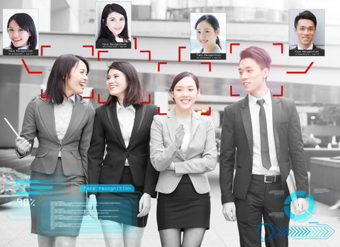Portraits with digital face recognition interface in modern office