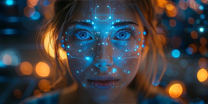 Woman with a glowing digital interface overlay on her face, representing advanced facial recognition and futuristic technology