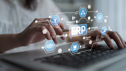 A close-up of hands on a laptop keyboard with an overlay of modern ERP software features. This image captures the essence of digital transformation in business operations. Tessel
