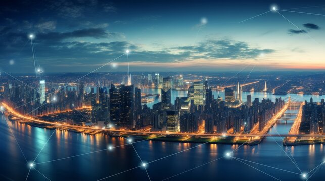 Futuristic city skyline with glowing data analytics and cybersecurity icons over digital network connections at dusk across waterfront buildings. Ai generative