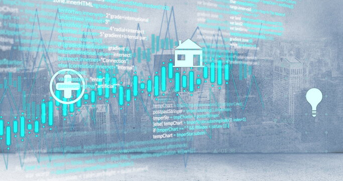 Image of diagrams and data processing over cityscape