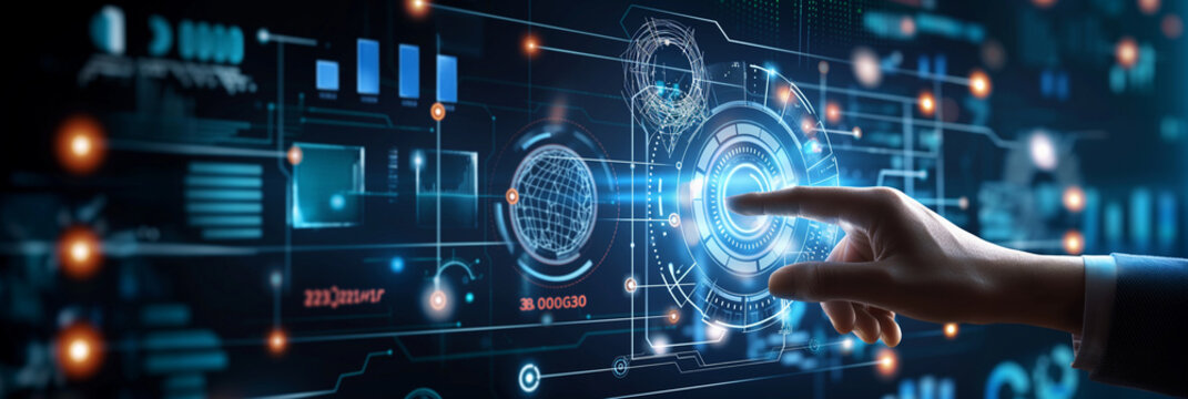 A hand interacting with a futuristic interface displaying data and charts