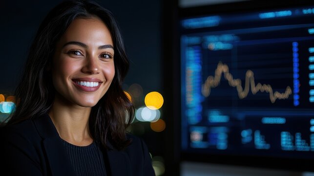 A woman is smiling in front of a computer monitor displaying a graph. Concept of confidence and professionalism, as the woman is dressed in a business suit and he is working in a corporate setting
