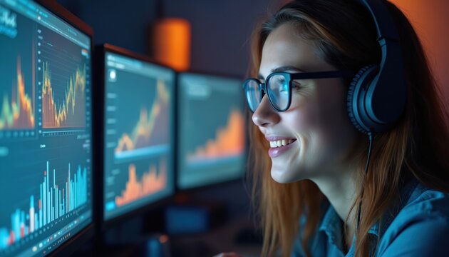 Young woman with glasses monitors data graphs on computer screen. Smiles wearing headphones. Data analysis at workplace. Tech, trading, finance, stock market. High-tech business. Modern workplace