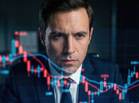 Intense Stock Trader Analyzing Market Trends with Neon Financial Data Overlay - Close-up Portrait with Analytics Graphics