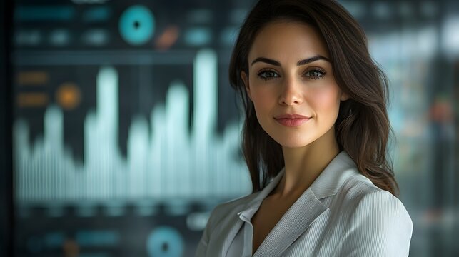 Confident Businesswoman Stands Amid Futuristic Financial Charts and Rising Graph