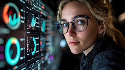 A focused woman wearing glasses analyses financial data on a screen