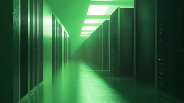 A modern data center aisle with rows of server racks, illuminated by overhead lights and featuring a digital network overlay.