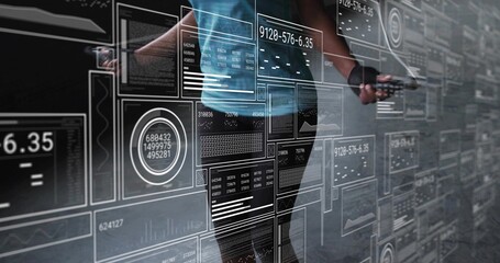 Tired athlete in gym with digital analytics overlay