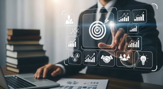 Business Professional Analyzing Data through Interactive Digital Interface with Graphs and Icons Representing Statistics and Team Collaboration