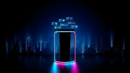 A futuristic podium with glowing neon lights displays data against a dark cityscape