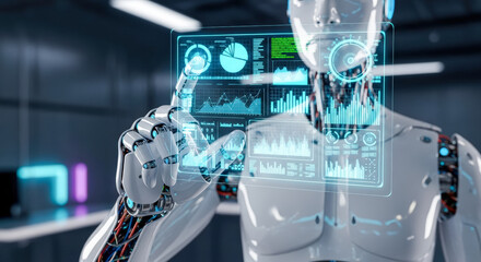 Robot hand touching virtual screen with business data for concept of artificial intelligence, future technology, and analytics