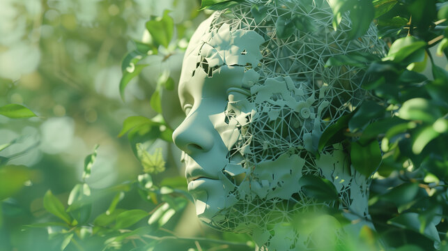 Futuristic humanoid figure encased in green foliage, surrounded by a lush, vibrant environment in a serene, high-tech setting. Generative AI