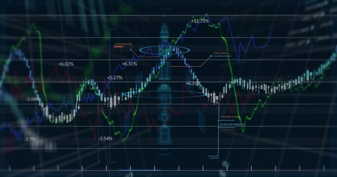 Displaying trading screen showing candlestick bars with rocket diagram and line graphs on grid