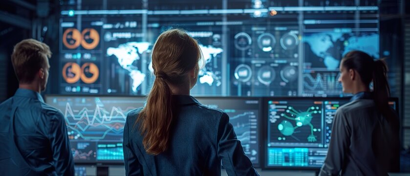Collaborative Data Analytics: Team of analysts gathered around a large digital display