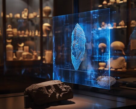 Holographic projection of an ancient artifact in a museum, Hologram, digital archaeology