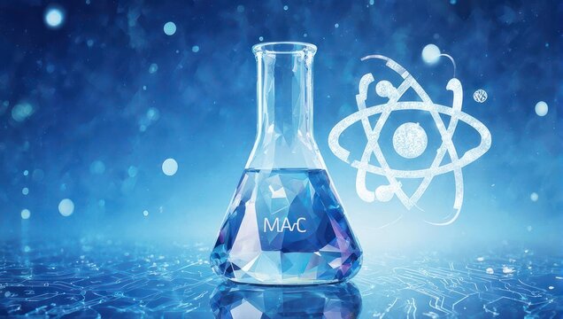 Atom molecular structure model composed of shiny chrome spheres connected by silver rods, depicting a scientific concept of chemistry, biotech, and engineering on a blue background