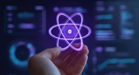 Hand holds glowing atom symbol