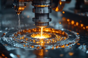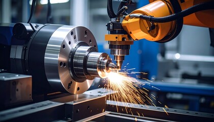A high-tech laser cutting machine in action, with sparks flying as it precisely shapes metal