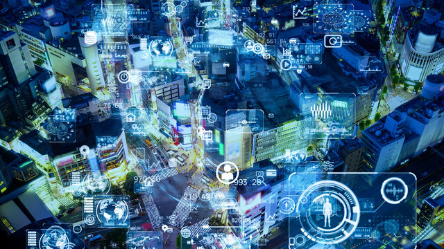 A mosaic tile pattern forms a wall background, featuring an abstract digital photo in light crimson and blue, data visualization, and light sky-blue and orange.