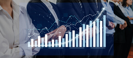 Business professionals in suits analyze financial growth trends using a digital graph with bar and line charts, showcasing teamwork and corporate strategy. Axiom