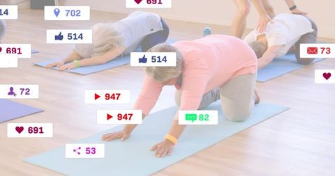 Mature women practicing gentle yoga and mobility exercises with social media overlays