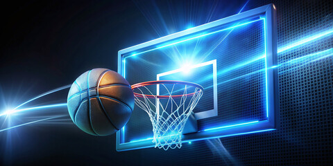 Dynamic basketball shot in futuristic glowing hoop, ideal for sports branding, fitness ads, game promotions, digital marketing, and team merchandise designs
