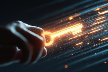 Hand Holding Digital Key Symbol with Glowing Data Streams