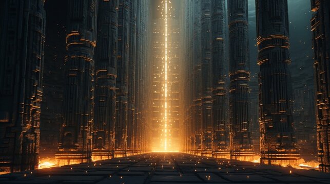 A column of binary code blended with a column of an ancient temple.