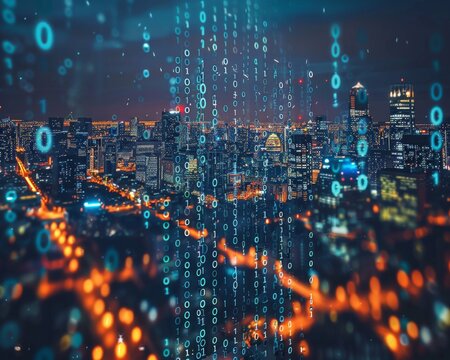 A captivating blend of binary code and urban environments showcases the interconnectedness of the digital realm with modern city life creating a visionary atmosphere.