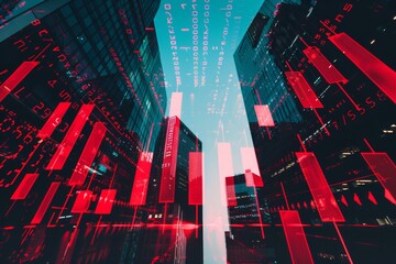 A surreal digital collage featuring skyscrapers and red data streams, illustrating the blend of modern architecture and technological data flow.