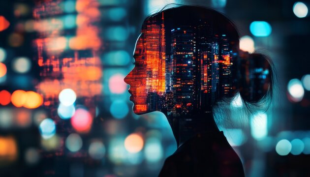 Futuristic urban life  woman s profile with vibrant digital cityscape double exposure in cyber age