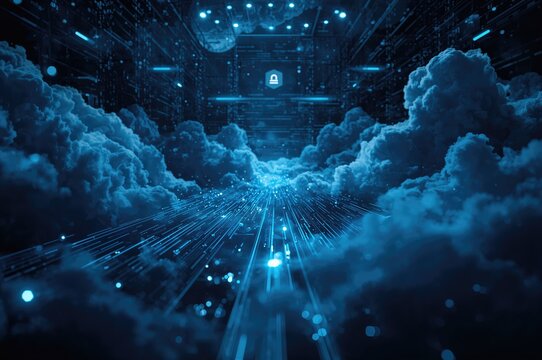 A digital padlock is displayed with a geometric wireframe design on a dark futuristic background