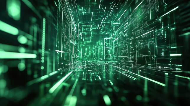 Digital data stream flowing through an abstract technological tunnel, creating a complex cyber information system architecture with glowing binary code and intricate circuit patterns