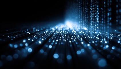 Abstract blue light streams cascade downwards, creating a digital curtain effect. Blurred cityscape provides a soft backdrop