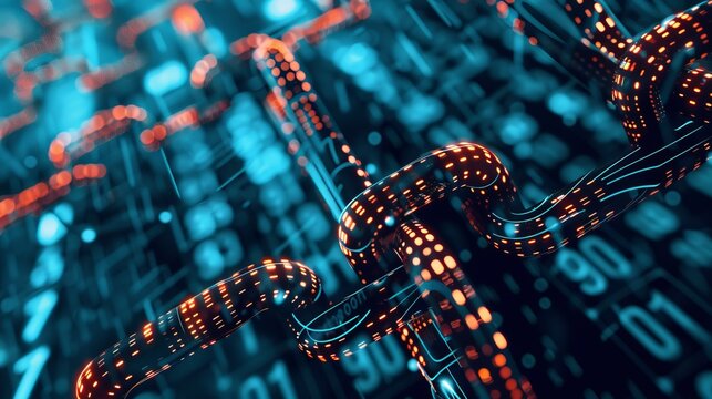 A conceptually abstract image of interconnected blockchain links embedded with binary data codes, symbolizing the secure and intricate structures of digital technology.