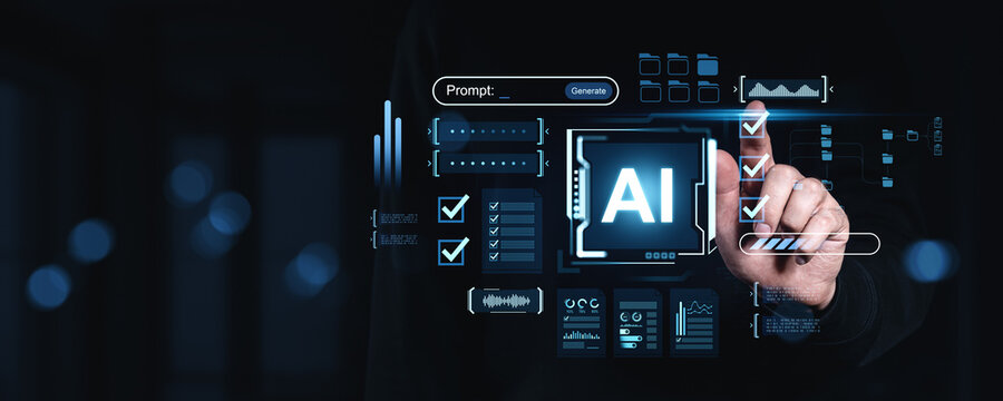 Futuristic AI interface with human hand interacting with digital prompt generation system in advanced smart technology environment concept..