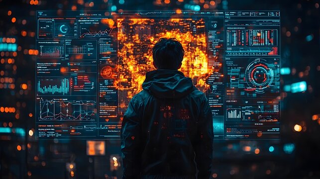 A person views a complex futuristic digital display with data visualizations and fiery abstract patterns