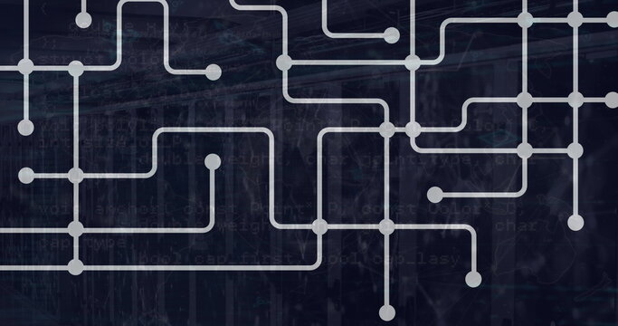 Animating microchip and binary code illuminate server room with vibrant colors during digital processing, Animating microchip and binary code over server room in data center