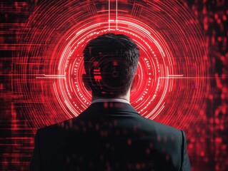 Back view of man in suit facing digital red target interface, representing cybersecurity, technology, and data analytics concepts.