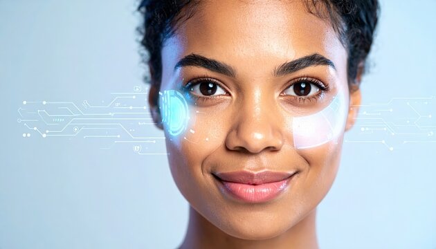 Close-up of a woman's eye with digital futuristic elements, glowing circuits, and binary code, representing advanced technology, AI, and innovation. Ai generative